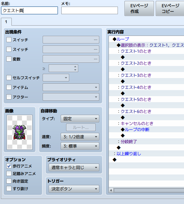 というわけで、今回はさっきのクエスト員さんの各選択肢にこれらを実行させていきます。簡単!これでクエストが6つもできた!