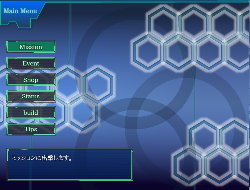 とりあえずオープニングが終わったらここに突入、ミッション終わったらここに突入、故にメイン画面。主にツキミ式選択肢ウィンドウの力を借りて作成している。