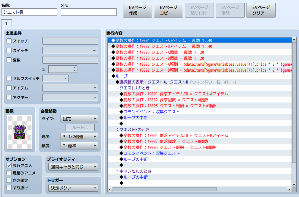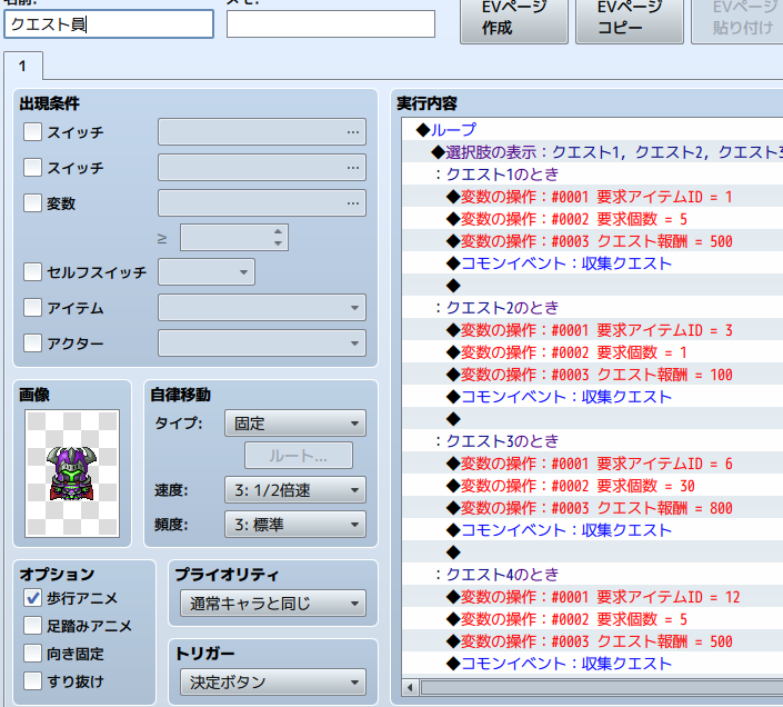 というわけで、今回はさっきのクエスト員さんの各選択肢にこれらを実行させていきます。簡単!これでクエストが6つもできた!