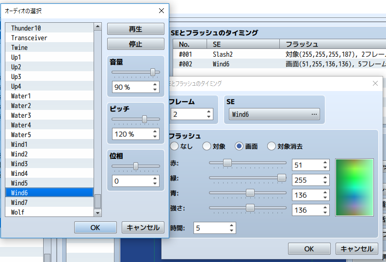 斬撃エフェクトもいい感じの緑になったので、次は音とフラッシュの設定をする。
