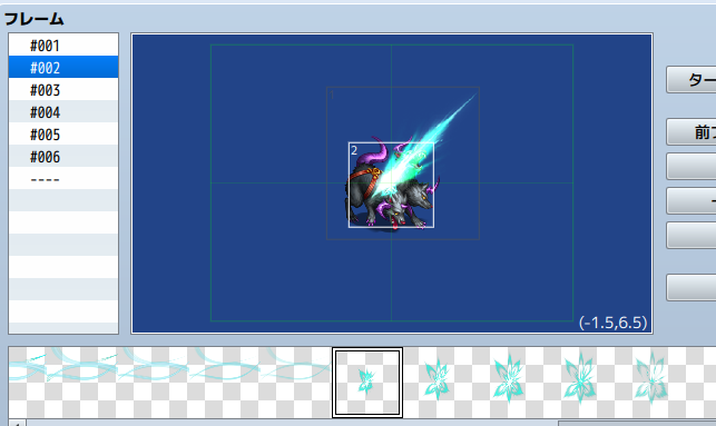 まずはこのエフェクトの画像で一番小さいのをフレーム2に、セル2として配置する。すごい大事な事なので2回いうが、セル2として配置する。