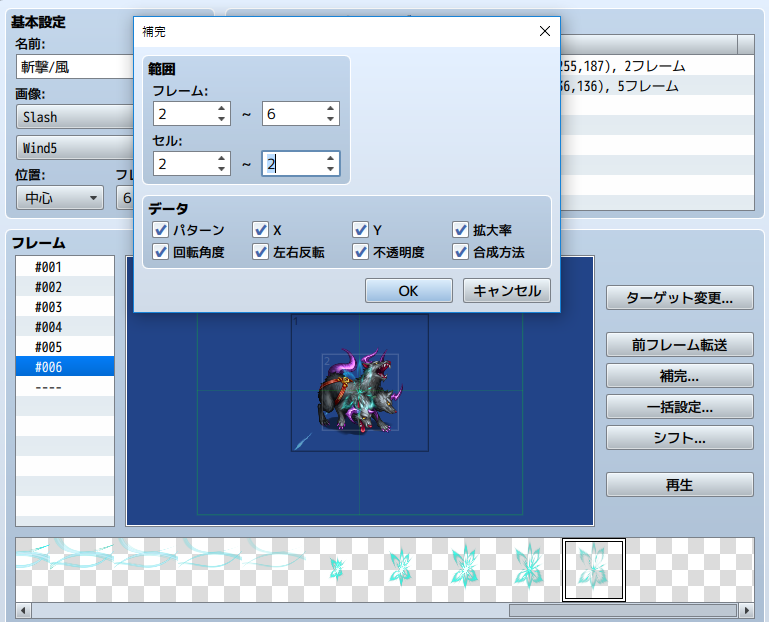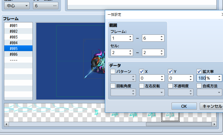 フレーム範囲は1~6(2~6でもいい)、セルは2~2、XとYを0に、拡大率を180に、回転角度を45にする。これでOKを押せば、セル2の画像が一括で変更される。